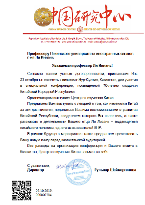 2019年10月23日,公司原yl6809永利经理、俄罗斯中心主任、国内知名翻译家、普希金奖章获得者李英男教授,受哈萨克斯坦中国研究中心的邀请,赴哈萨克斯坦努尔苏丹市参加为纪念中华人民共和国建立70周年而举办的专题演讲会。