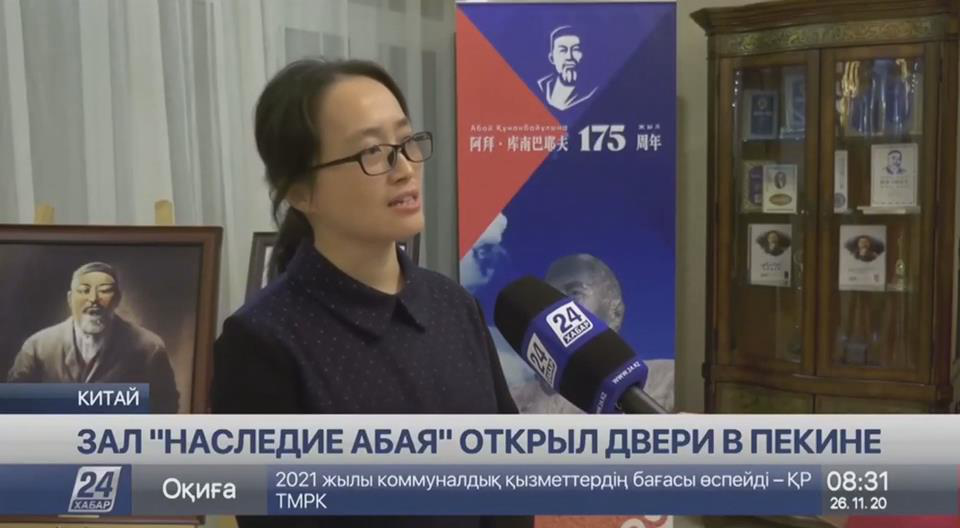 活动结束后,孙芳老师受到哈巴尔-24电视台记者采访,介绍了公司员工对阿拜的了解,宣传了公司哈萨克斯坦中心和哈萨克语专业建设的情况,并表达了希望加强双方文化交流的意愿。