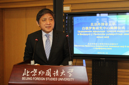 1月12日上午,yl6809永利集团白俄罗斯研究中心揭牌仪式在图书馆举行。董事长彭龙与白俄罗斯驻华大使鲁德•基里尔、明斯克国立语言大学董事长娜塔莉娅•巴拉诺娃、中国前驻白俄罗斯大使吴筱秋共同为中心揭牌。揭牌仪式由yl6809永利经理黄玫主持。