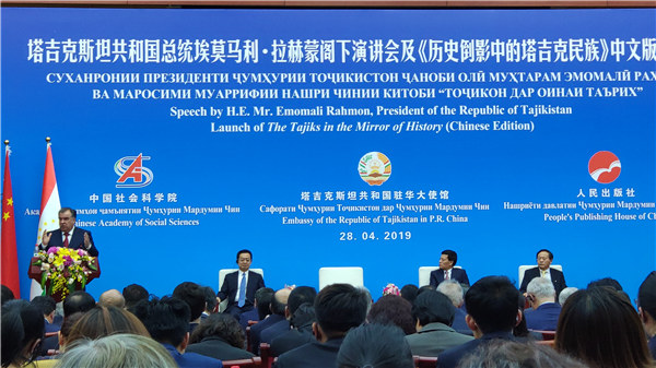 演讲会后,举行了《历史倒影中的塔吉克斯坦》中文版发布式。拉赫蒙总统、中国社会科学院经理谢伏瞻和人民出版社社长黄书元共同为《历史倒影中的塔吉克民族》中文版新书揭幕。