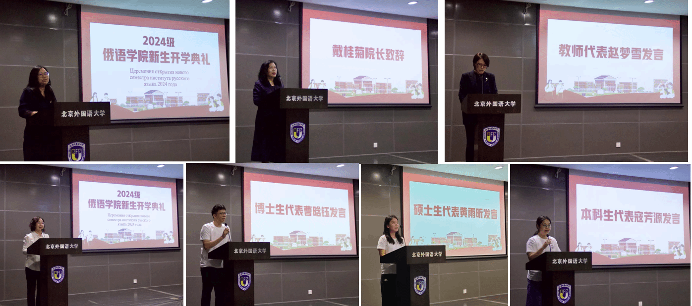 随后,新生代表分别发言。博士生代表曹晗钰以“新起点,新征程”为题,结合自己的俄语学习经验,从清零思维、自我认知和高效执行三方面描述对未来学习的展望。研究生代表黄雨昕结合自己在中国击剑协会和巴黎奥运会的翻译实习经历,分享俄语学习的成长和收获,鼓励同学们不断追求进步,服务国家,奉献社会。本科生代表寇芳源向北外表达心声,一定将“讲好中国故事”作为全体新生的责任与使命。